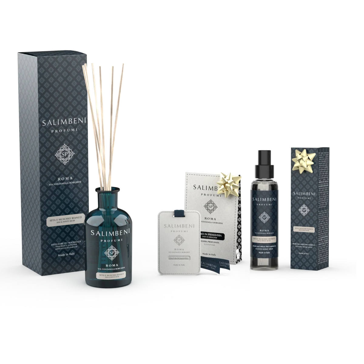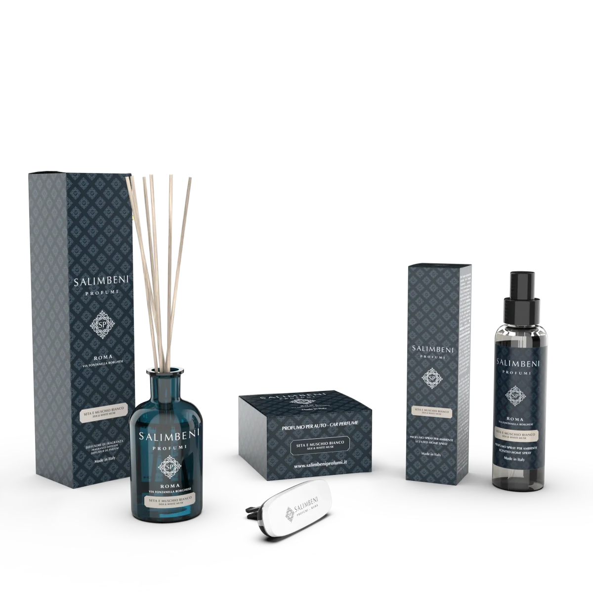 Seta e Muschio Bianco 250ml + Profumatore auto bianco Seta e Muschio Bianco + Profumo Spray per Ambienti 150ml Seta e Muschio Bianco