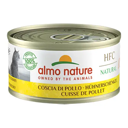 Preparate con pochi ingredienti e cucinate semplicemente in brodo, le ricette HFC sono ideali per idratare naturalmente il gatto, grazie al loro ricco brodo di cottura. HFC Natural 70g: la lattina più famosa di Almo Nature e la sua ricetta tradizionale.
