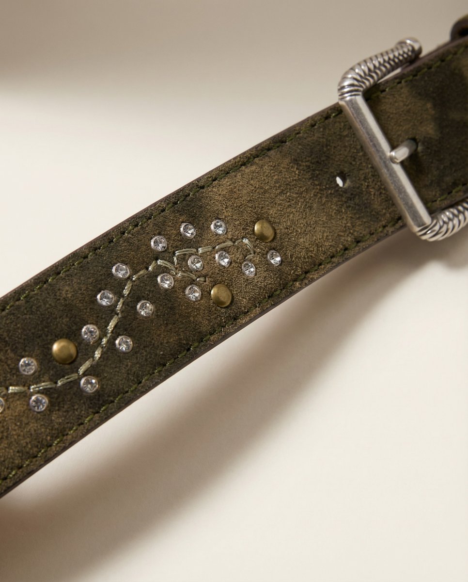 - Dettagli: Applicazioni metalliche di borchie decorative lungo la cintura