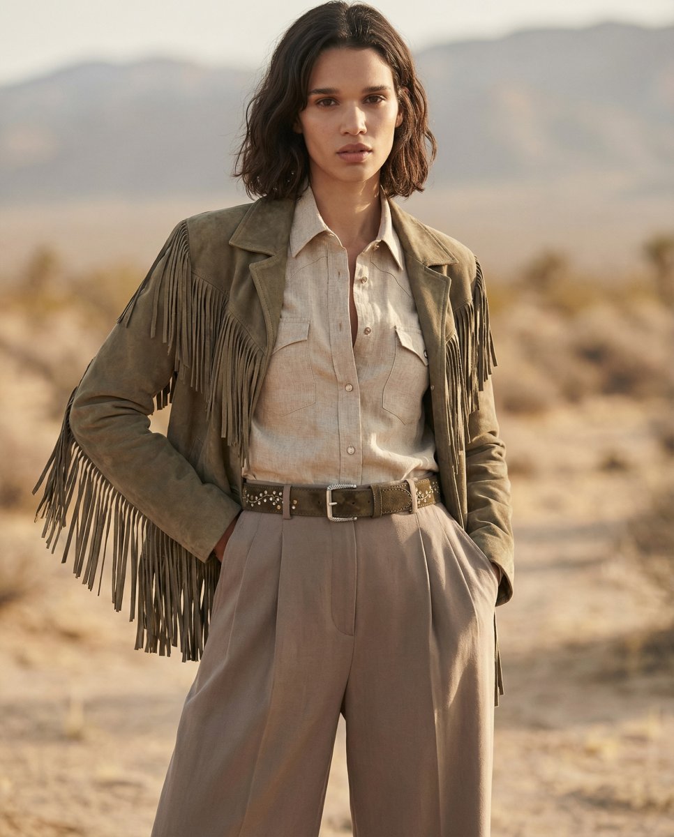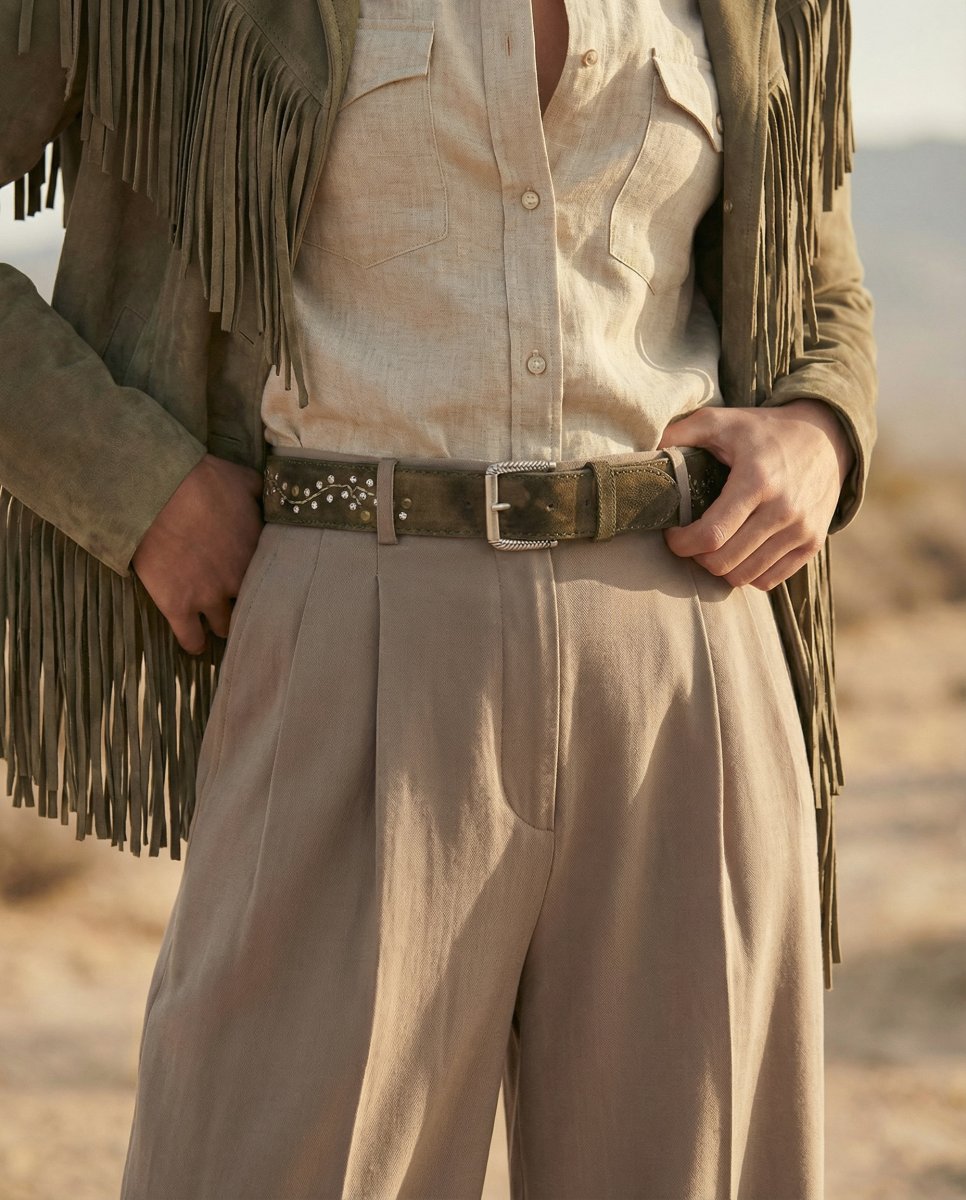 - Stile: Western contemporaneo dal carattere deciso. Le sfumature irregolari della pelle e le borchie metalliche creano un’estetica autentica e vissuta, bilanciata dall’eleganza della fibbia Zina.