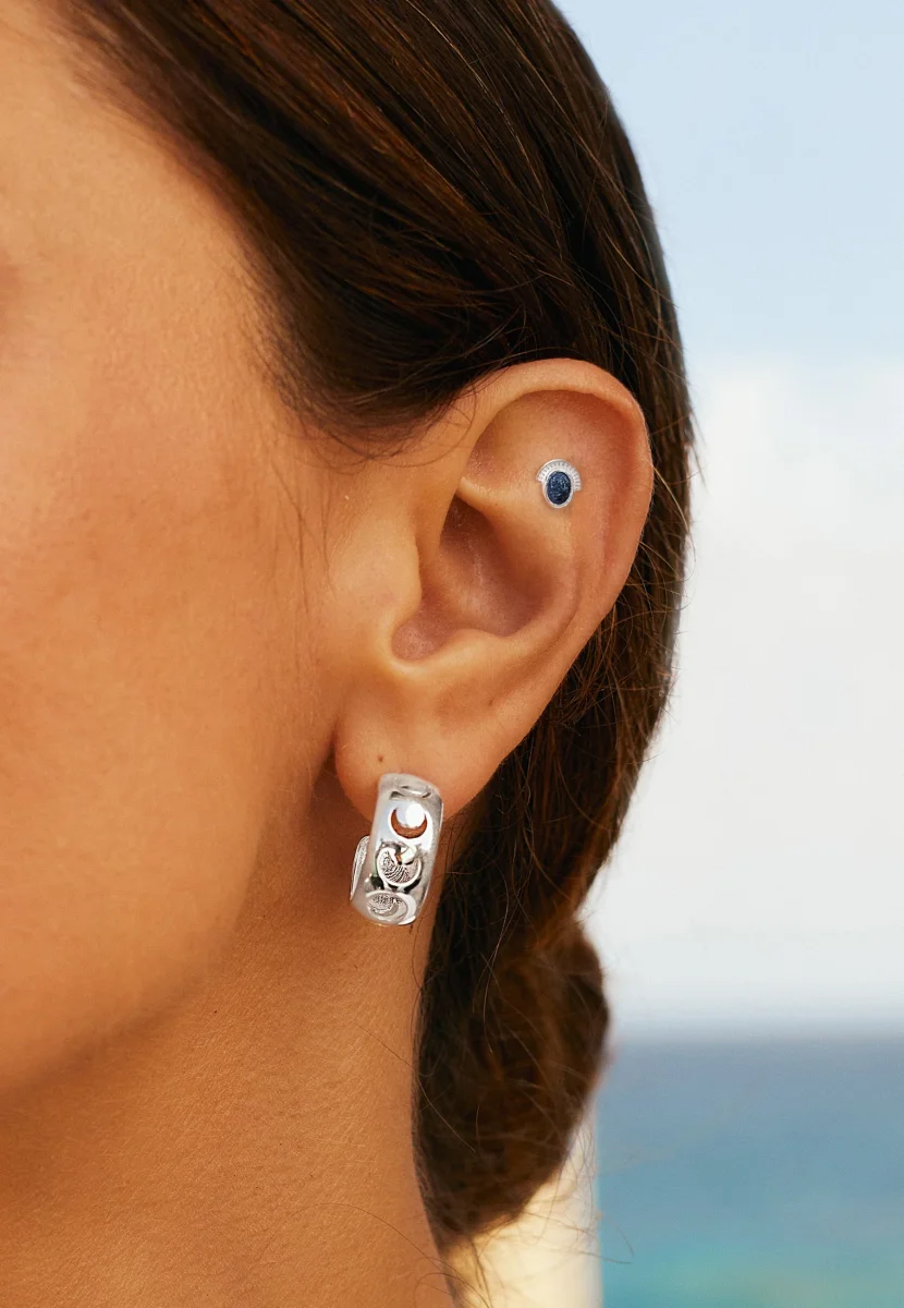 El piercing cuenta con una impresionante piedra de sodalita, conocida por sus vibrantes tonos azules y blancos, que aporta un toque de elegancia y naturalidad. En su parte inferior, un delicado diseño étnico añade un encanto especial, haciendo de este pendiente una verdadera joya de arte.