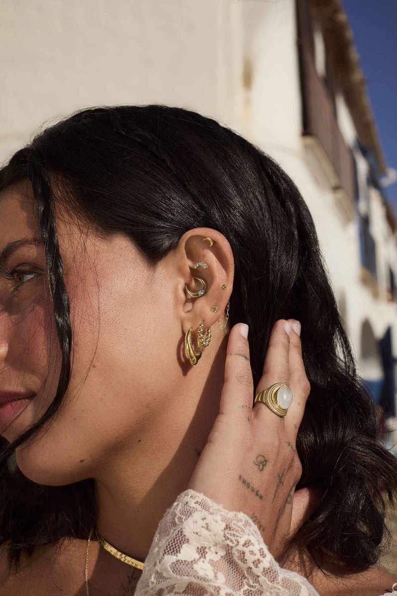 Su diseño de doble aro entrelazado con circonita central combina elegancia y simbolismo lunar. La luz del oro realza aún más el brillo discreto de la circonita, creando un efecto luminoso que aporta sofisticación y delicadeza al look.