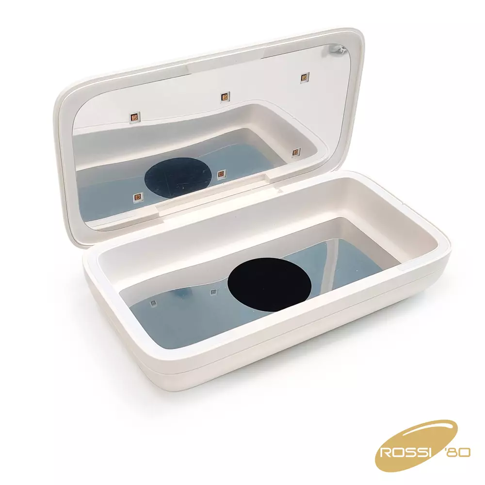 Vaschetta Sterilizzanti con radiazioni UVC eco-friendly, priva di sostanze chimiche e altamente efficiente. La radiazione UV ad alta energia distrugge la struttura dei filamenti di DNA e RNA in modo che i germi non possano più riprodursi. L’efficacia raggiunge il 99,9% dopo pochi minuti. Inoltre, il dispositivo offre una funzione di ricarica QI per i telefoni cellulari.